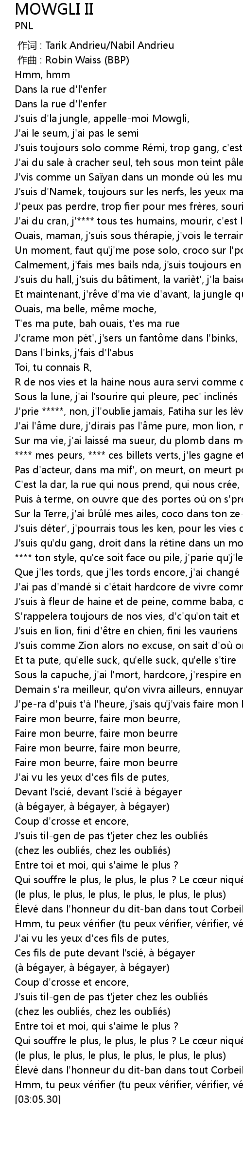 | [00:11.13] | J'suis d'la jungle, appelle-moi Mowgli, |