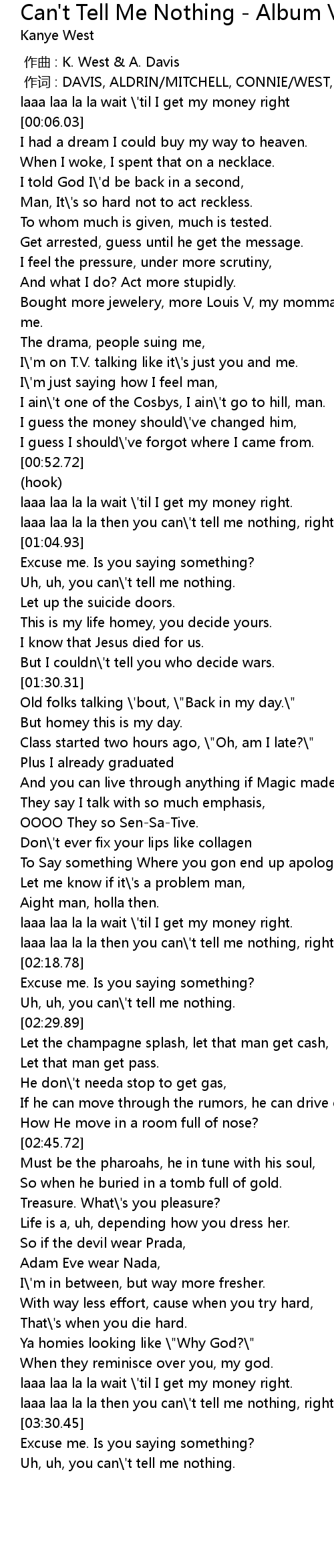 | [03:34.88] | Uh, uh, you can\'t tell me nothing. |