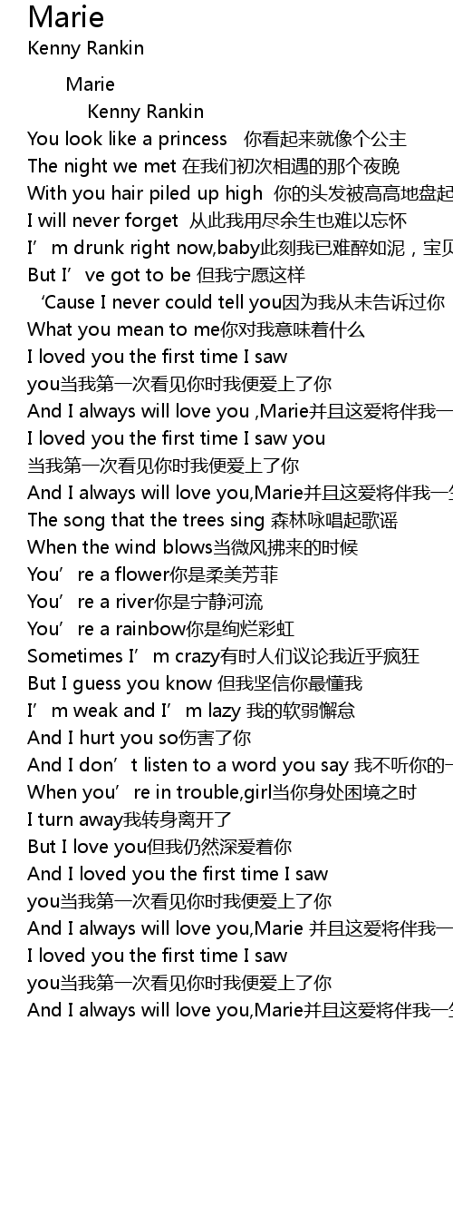 | [01:20.37] | And I always will love you, Marie bìng qiě zhè ài jiàng bàn wǒ yī shēng, mǎ lì |