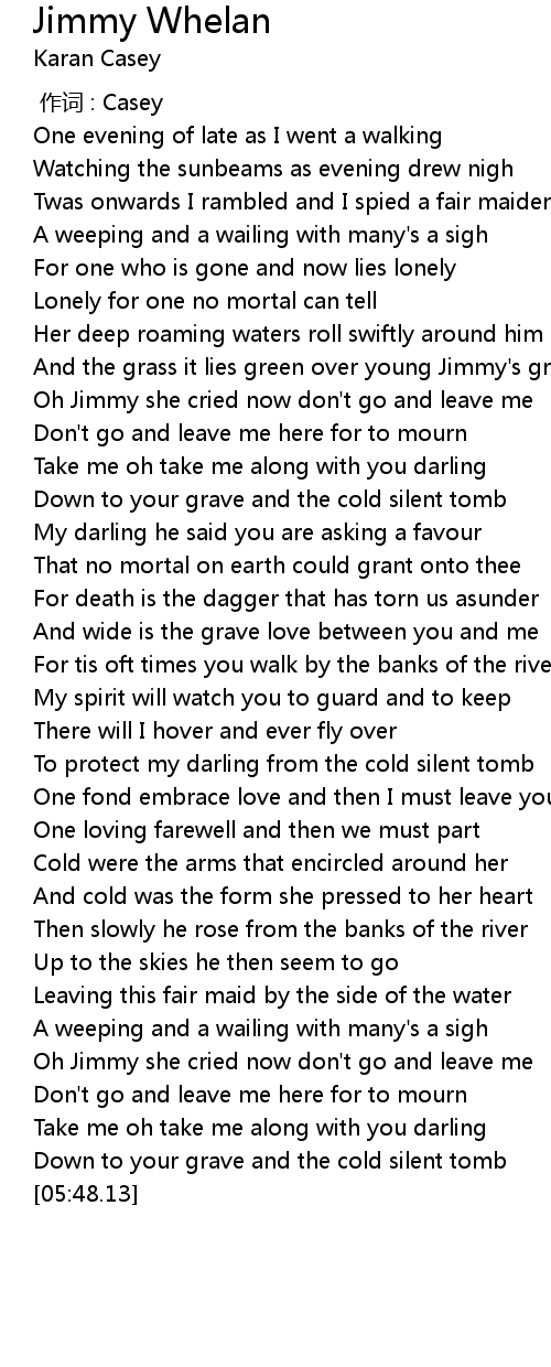 | [05:00.57] | Oh Jimmy she cried now don't go and leave me |