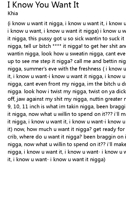 (i know u want it nigga, i know u want it, i know u want-i know u want it nigga, i know u want, i know u want it nigga) i know u want it nigga, the way i flaunt it nigga, this pussy got u so sick wantin to suck it nigga, touch it and **** it nigga, tell ur bitch **** it nigga! to get her shit and just dip, im what u wantin nigga, look how u sweatin nigga, cant even help it nigga, now what u came up to see me step it nigga? call me and bettin nigga, go down and smell it nigga, summer's eve with the freshness ( i know u want it nigga, i know u want it, i know u want-i know u want it nigga, i know u want it) i'm what u wantin nigga, cant even front my nigga, im the bitch u dreamed bout when u was younger nigga. look how i twist my nigga, twist on ya dick my nigga, ill take it all off, jaw against my shit my nigga, nuttin greater nigga, and i aint fakin nigga, 9, 10, 11 inch is what im takin nigga, been braggin on it nigga, and now u want it nigga, now what u willin to spend on it??? i'll make you cum ( i know u want it nigga, i know u want it, i know u want-i know u want it nigga, i know u want it) now, how much u want it nigga? get ready for it nigga, outside or in the crib, where do u want it nigga? been braggin on it nigga, and now u want it nigga, now what u willin to spend on it?? i'll make you cum (i know u want it nigga, i know u want it, i know u want- i know u want it nigga, i know u want it, i know u want- i know u want it nigga) |