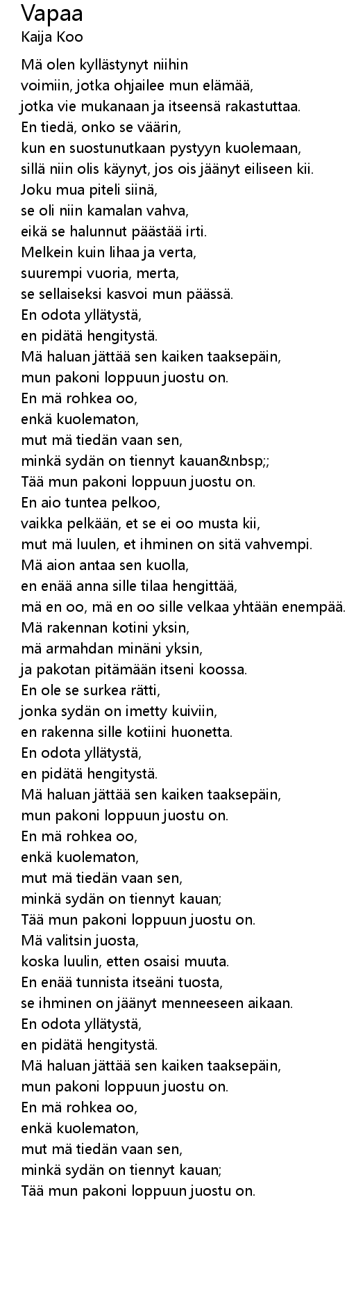 | mä en oo, mä en oo sille velkaa yhtään enempää. | |
