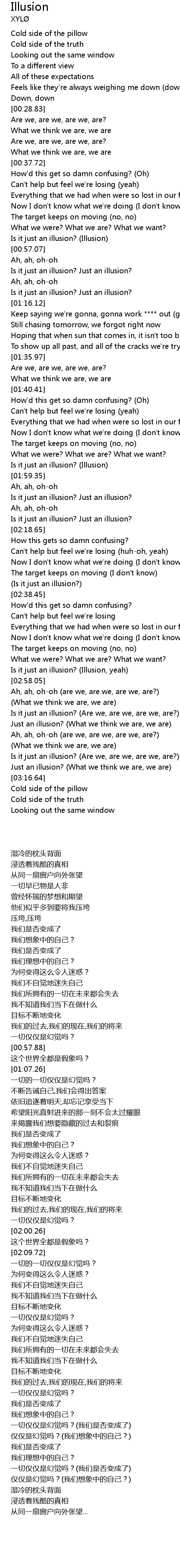 | [03:02.93] | Is it just an illusion? (Are we, are we, are we, are?) |