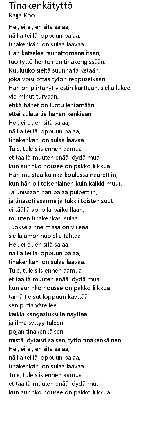 | mistä löytäisit sä sen, tyttö tinakenkäinen | |