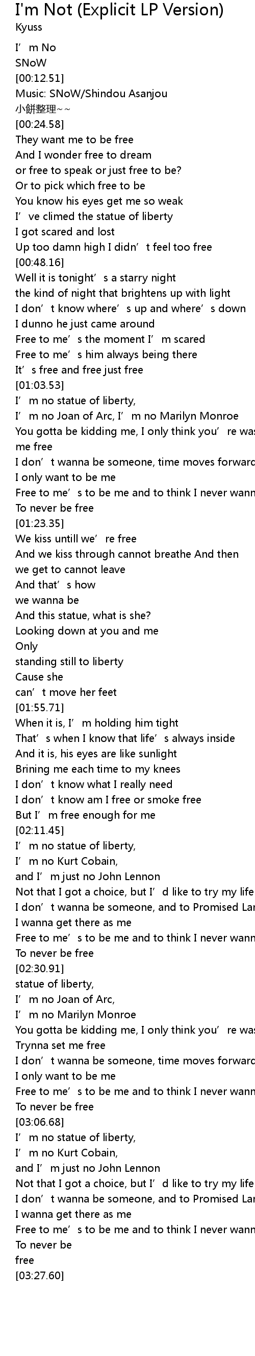 | [03:00.86] | Free to me' s to be me and to think I never wanna be without him |