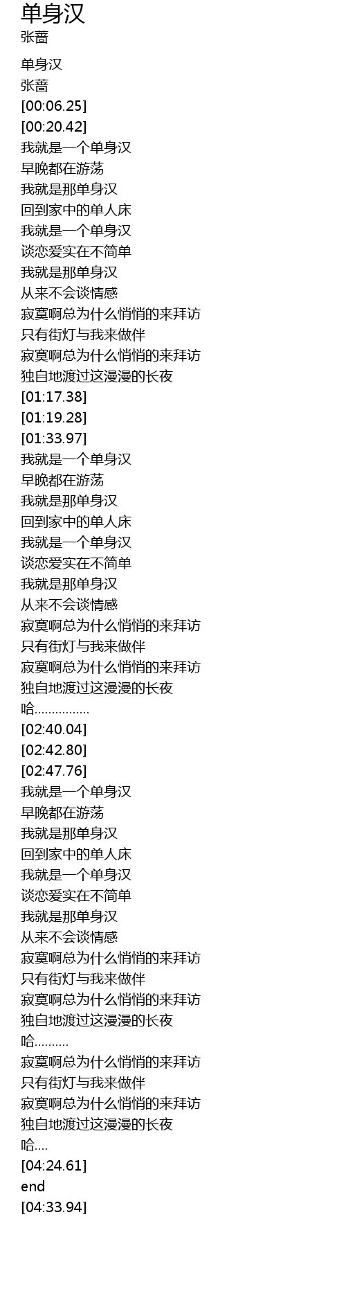 | [00:22.43] | wǒ jiù shì yí gè dān shēn hàn |