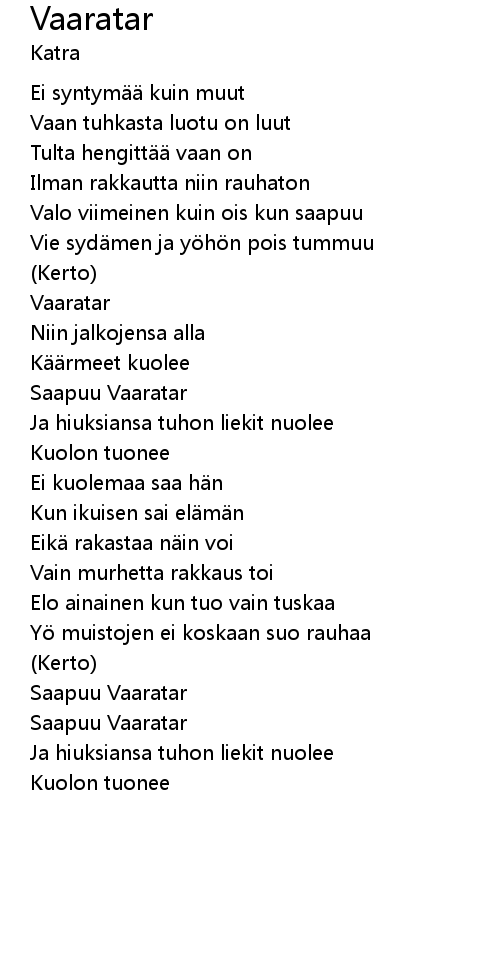 | Ja hiuksiansa tuhon liekit nuolee | |