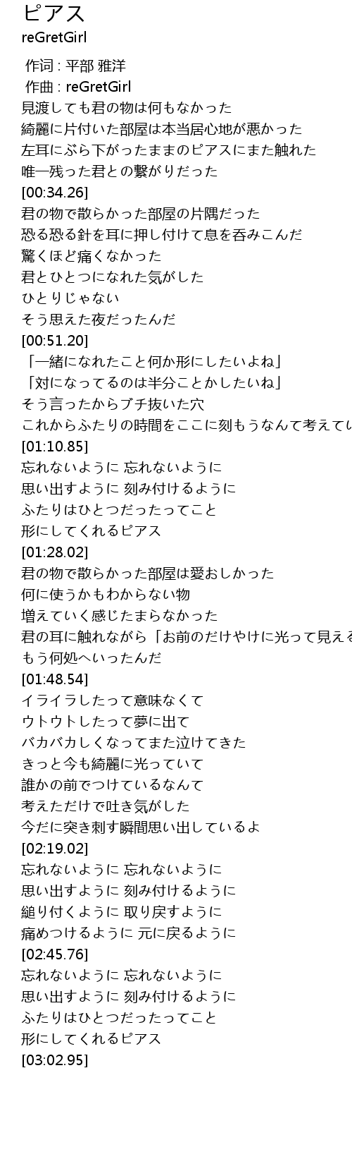| [00:24.27] | 左耳にぶら下がったままのピアスにまた触れた |