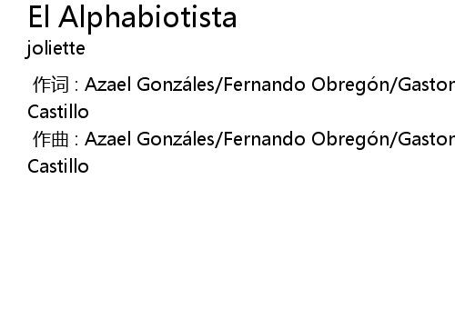 | [00:00.000] | 作曲 : Azael Gonzáles/Fernando Obregón/Gaston Prado/Juan Pablo Castillo |