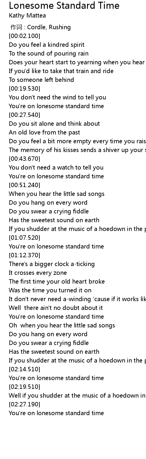 | [02:30.120] | You're on lonesome standard time |