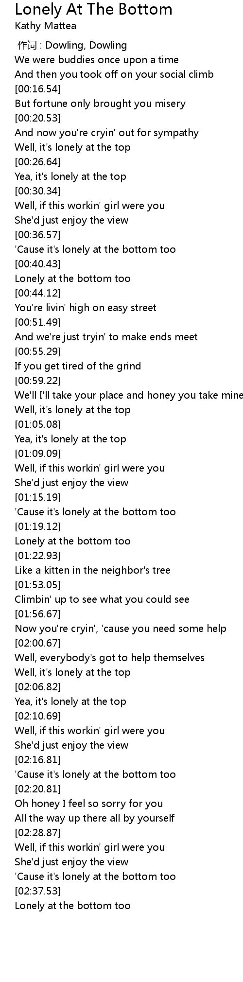 | [00:37.25] | 'Cause it's lonely at the bottom too |