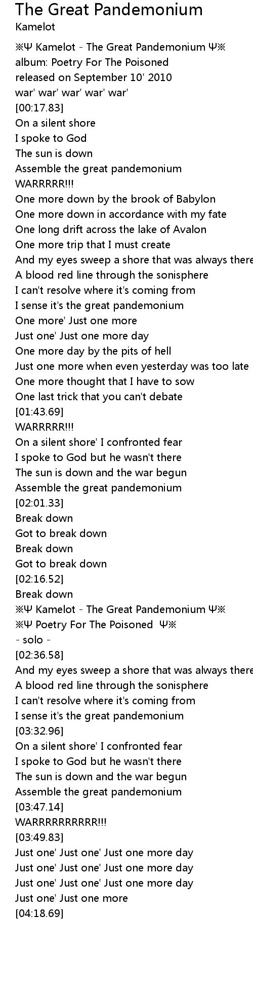 | [02:24.02] | ※Ψ Kamelot - The Great Pandemonium Ψ※ |