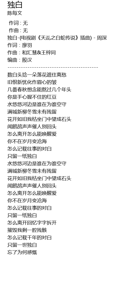 | [00:10.445] | 独白-(电视剧《天乩之白蛇传说》插曲) - 周深 |