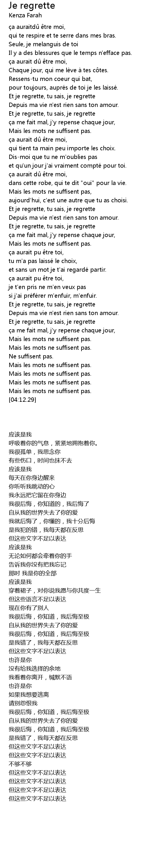 | [03:29.74] | Et je regrette, tu sais, je regrette |