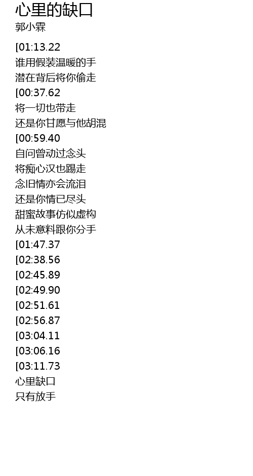 | [00:11.44][01:13.22][02:22.89][03:19.25] | 郭小霖-心里的缺口(粤) |
