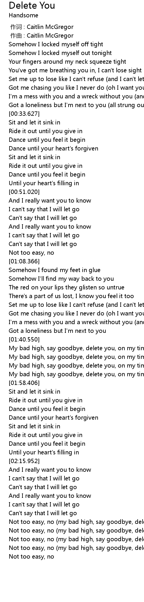| [02:31.485] | Not too easy, no my bad high, say goodbye, delete you, on my time |