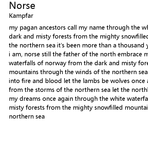 my pagan ancestors call my name through the white waterfalls of norway from the dark and misty forests from the mighty snowfilled mountains through the winds of the northern sea it's been more than a thousand years but still i am proud still i am, norse still the father of the north embrace my soul through the white waterfalls of norway from the dark and misty forests from the mighty snowfilled mountains through the winds of the northern sea let the fields and homes turn into fire and blood let the lambs be wolves once again i feel a pagan breeze from the storms of the northern sea let the northland of supreme be the north of my dreams once again through the white waterfalls of norway from the dark and misty forests from the mighty snowfilled mountains through the winds of the northern sea