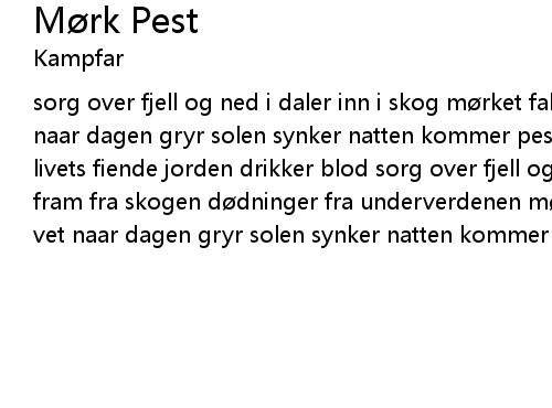 | sorg over fjell og ned i daler inn i skog mørket faller over landet ingen vet naar dagen gryr solen synker natten kommer pesten dreper lystes barn svart gift livets fiende jorden drikker blod sorg over fjell og ned i daler onde krefter fram fra skogen dødninger fra underverdenen mørket faller over landet ingen vet naar dagen gryr solen synker natten kommer pesten dreper lystes barn |