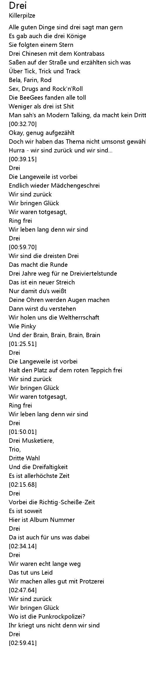 | [01:06.36] | Drei Jahre weg für ne Dreiviertelstunde |