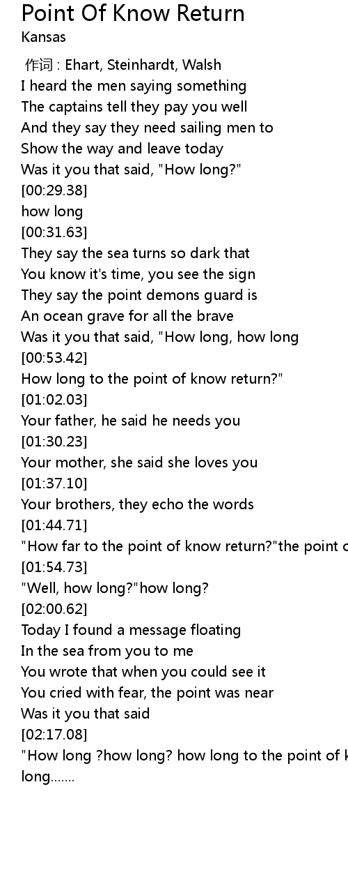 | [02:20.54] | "How long ?how long? how long to the point of know return?" how long....... |