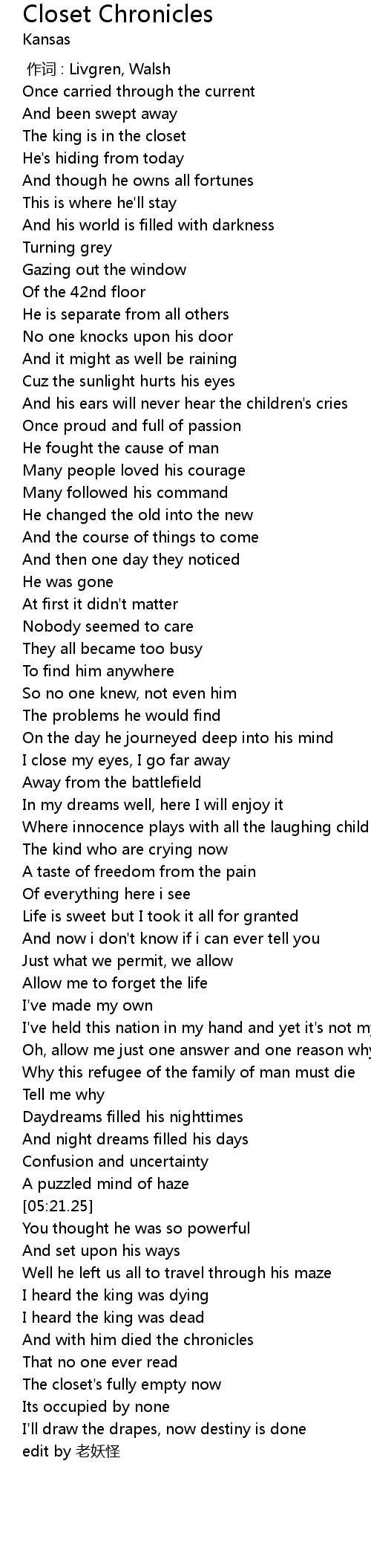 | [00:00.00] | 作词 : Livgren, Walsh |