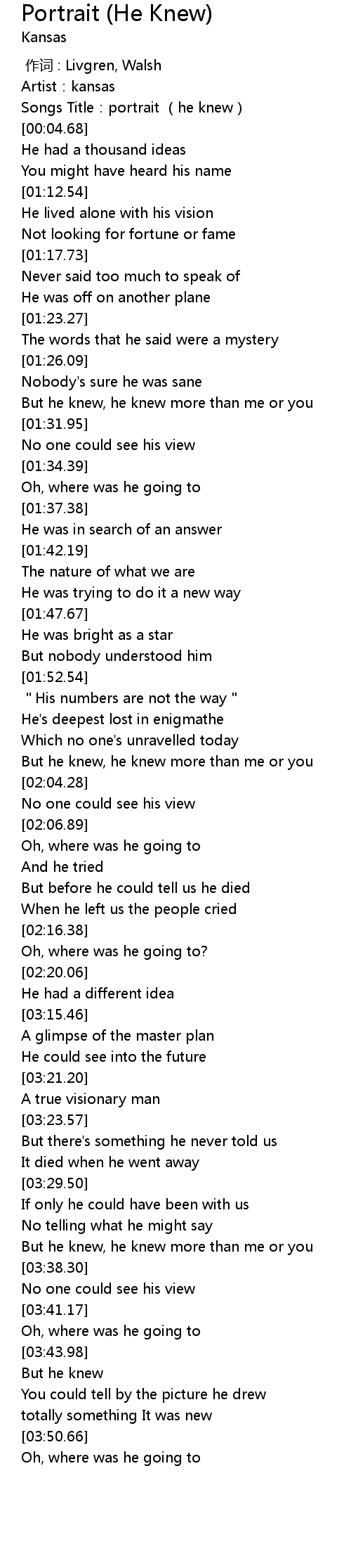 | [00:01.31] | Songs Title:portrait (he knew) |