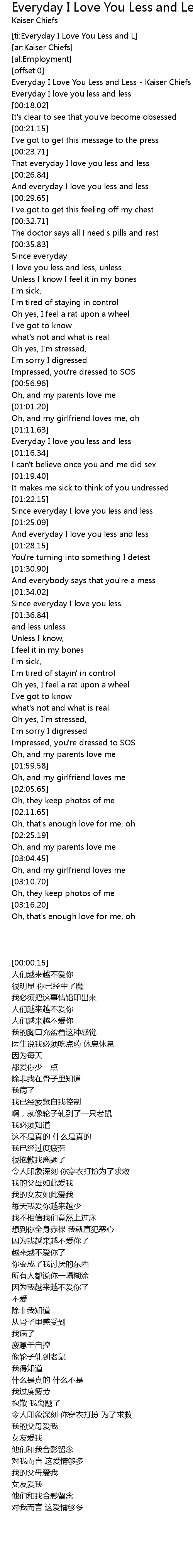 [00:00.15] Everyday I Love You Less and Less - Kaiser Chiefs