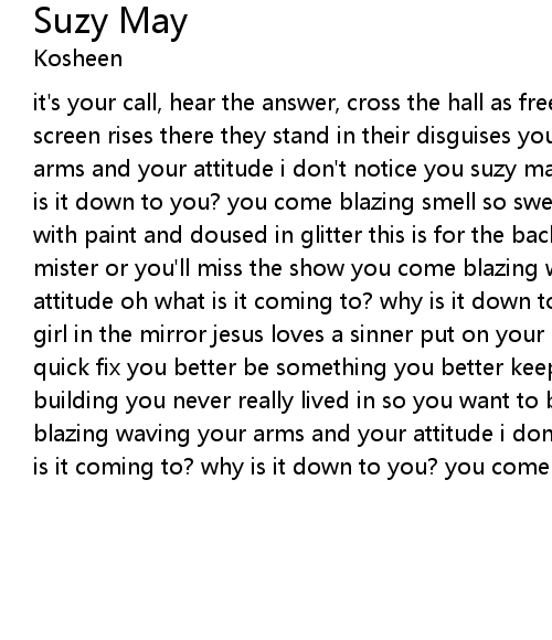 | it's your call, hear the answer, cross the hall as freedom dances as the smoke screen rises there they stand in their disguises you come blazing waving your arms and your attitude i don't notice you suzy may oh what is it coming to? why is it down to you? you come blazing smell so sweet and taste so bitter struck with paint and doused in glitter this is for the back row you better stand up mister or you'll miss the show you come blazing waving your arms and your attitude oh what is it coming to? why is it down to you? you come blazing little girl in the mirror jesus loves a sinner put on your lipstick and get another quick fix you better be something you better keep on running or jump from a building you never really lived in so you want to be a superstar? yeah you come blazing waving your arms and your attitude i don't notice you suzy may oh what is it coming to? why is it down to you? you come blazing |
