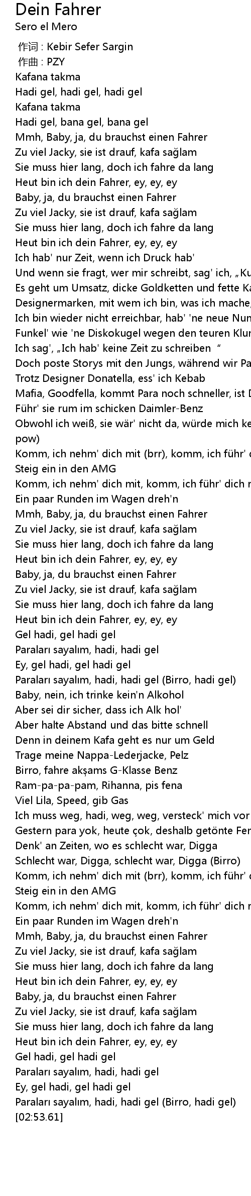 | [00:35.99] | Heut bin ich dein Fahrer, ey, ey, ey |