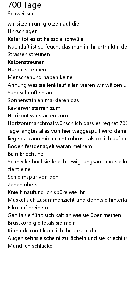 | Tage langbis alles von hier weggespü lt wird damit ich wieder atmen kannich liege da kann mich nicht rü hrnso als ob ich auf dem | |