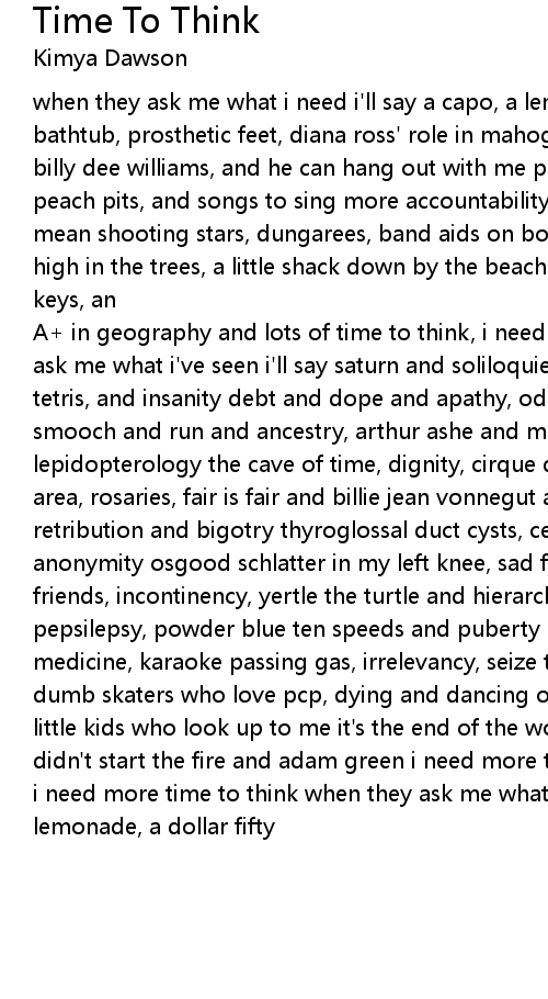 A+ in geography and lots of time to think, i need more time to think when they ask me what i've seen i'll say saturn and soliloquies walden pond, hypocrisy, tetris, and insanity debt and dope and apathy, ode to joy and pool parties smooch and run and ancestry, arthur ashe and manatees sailboats, necessity, lepidopterology the cave of time, dignity, cirque du soleil and lethargy surface area, rosaries, fair is fair and billie jean vonnegut at the university, karmic retribution and bigotry thyroglossal duct cysts, celibacy, love on the rocks, anonymity osgood schlatter in my left knee, sad flute solos and decaf tea silly friends, incontinency, yertle the turtle and hierarchy do it for johnny, pepsilepsy, powder blue ten speeds and puberty sylvia plath, conspiracies, bad medicine, karaoke passing gas, irrelevancy, seize the day and let it be loving dumb skaters who love pcp, dying and dancing on mtv close calls and infinity, little kids who look up to me it's the end of the world as we know it and we didn't start the fire and adam green i need more time to think, don't you think? i need more time to think when they ask me what i need i'll say a capo, a lemonade, a dollar fifty |