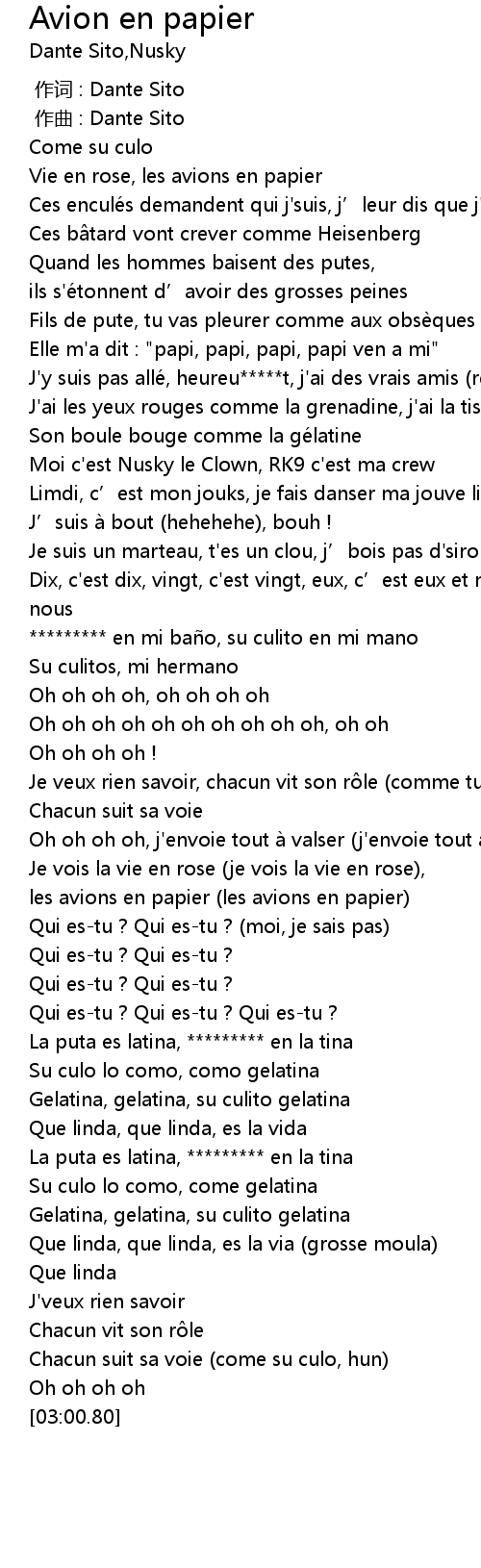 | [00:36.34] | Ces enculé s demandent qui j' suis, j' leur dis que j' suis sonneper |