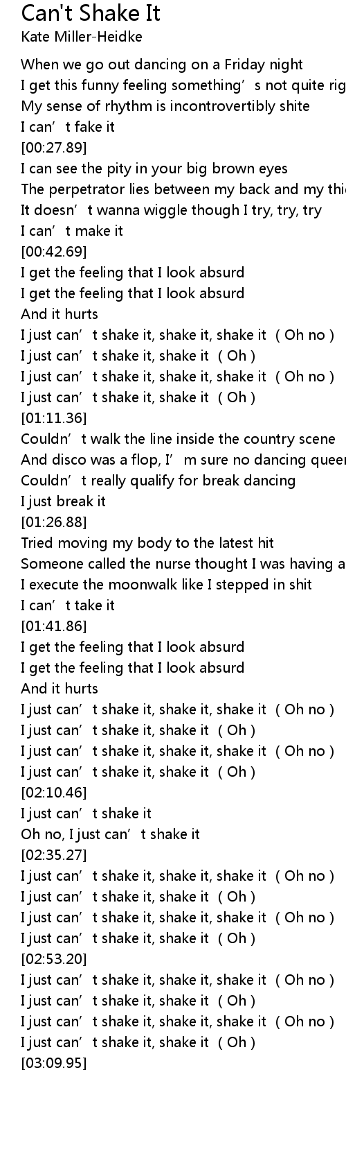 | [03:01.51] | I just can' t shake it, shake it, shake it Oh no |