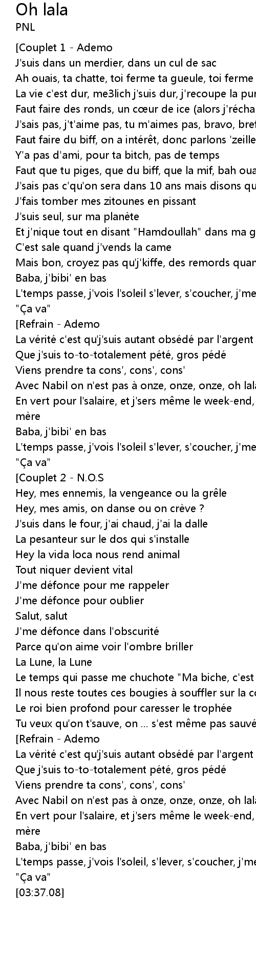 | [03:14.20] | Avec Nabil on n'est pas à onze, onze, onze, oh lala |