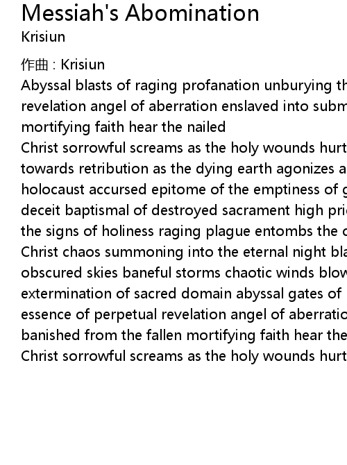 | Abyssal blasts of raging profanation unburying the essence of perpetual revelation angel of aberration enslaved into submission banished from the fallen mortifying faith hear the nailed | |