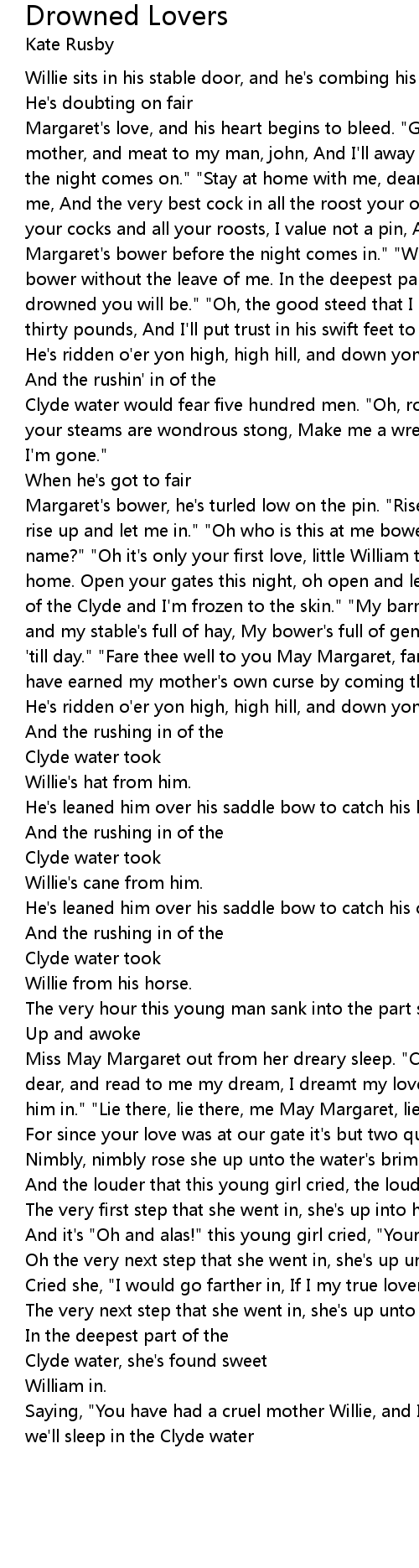 Margaret's love, and his heart begins to bleed. "Give corn unto my horse, mother, and meat to my man, john, And I'll away to fair Margaret's bower before the night comes on." "Stay at home with me, dear Willie, oh stay at home with me, And the very best cock in all the roost your own supper will be." "For all your cocks and all your roosts, I value not a pin, And I'll away to fair Margaret's bower before the night comes in." "Well if you go to fair Margaret's bower without the leave of me. In the deepest part of the Clyde water, then drowned you will be." "Oh, the good steed that I ride upon, cost me thrice thirty pounds, And I'll put trust in his swift feet to take me safe and sound." |