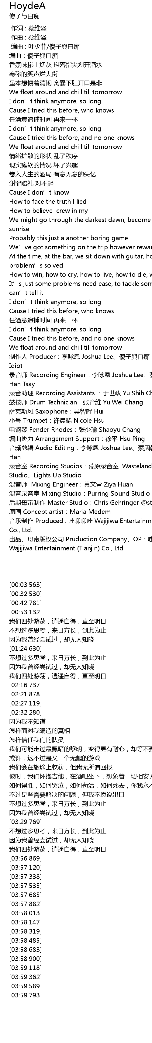 | [03:56.869] | zhì zuò rén Producer: lǐ yǒng ēn Joshua Lee shǎ zi yǔ bái chī Fool and Idiot |