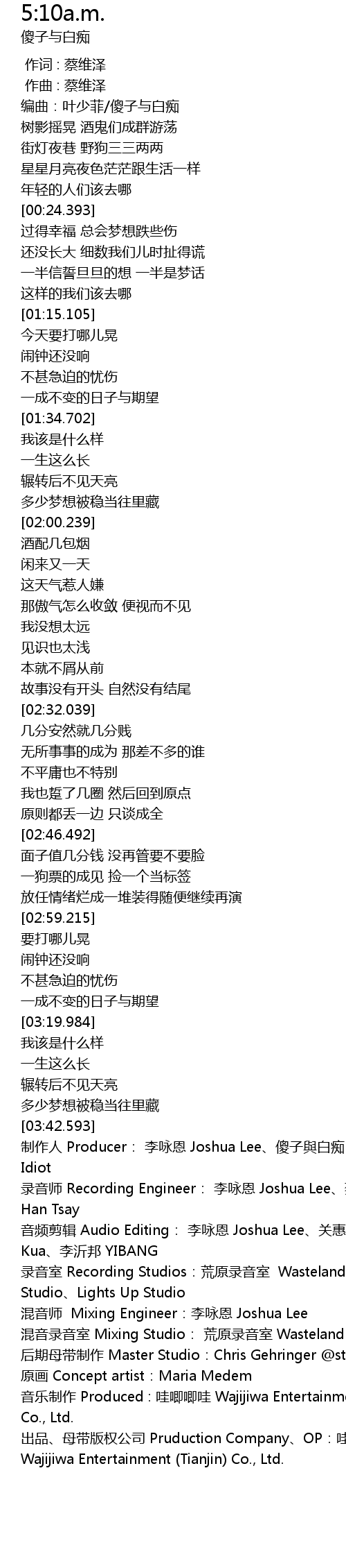 | [03:44.645] | zhì zuò rén Producer: lǐ yǒng ēn Joshua Lee shǎ zi yǔ bái chī Fool and Idiot |