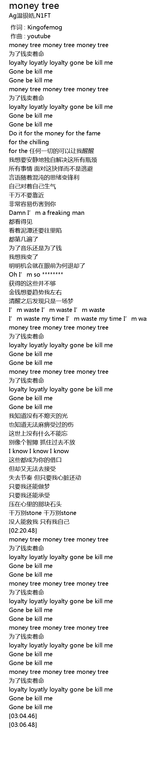 | [02:58.68] | loyalty loyatly loyalty gone be kill me |