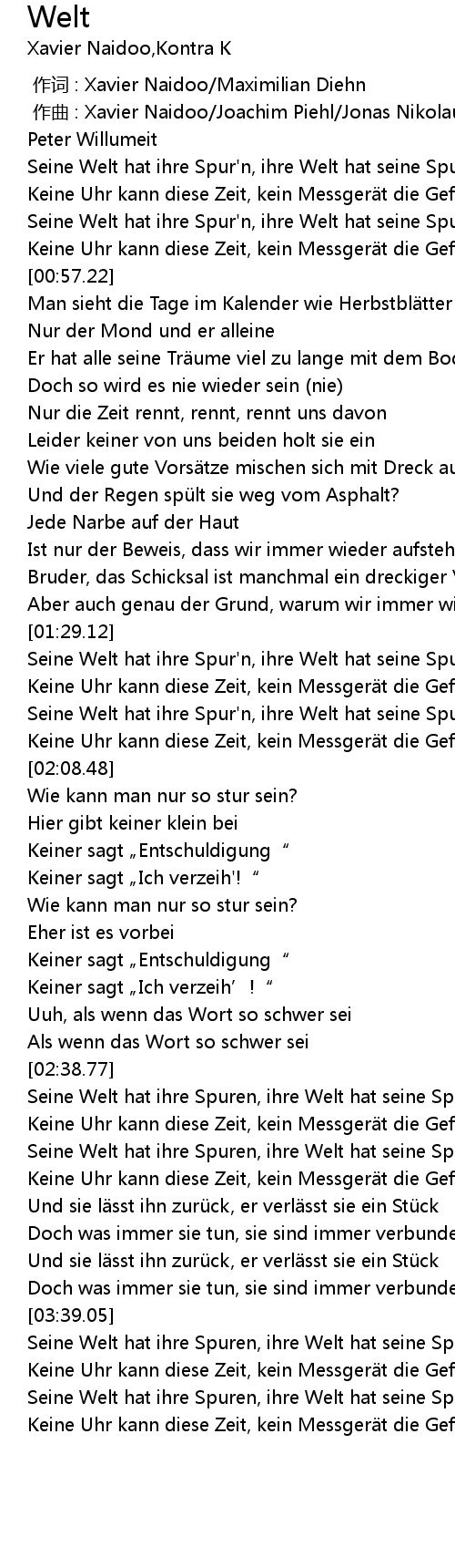 | [03:40.42] | Seine Welt hat ihre Spuren, ihre Welt hat seine Spuren hinterlassen |