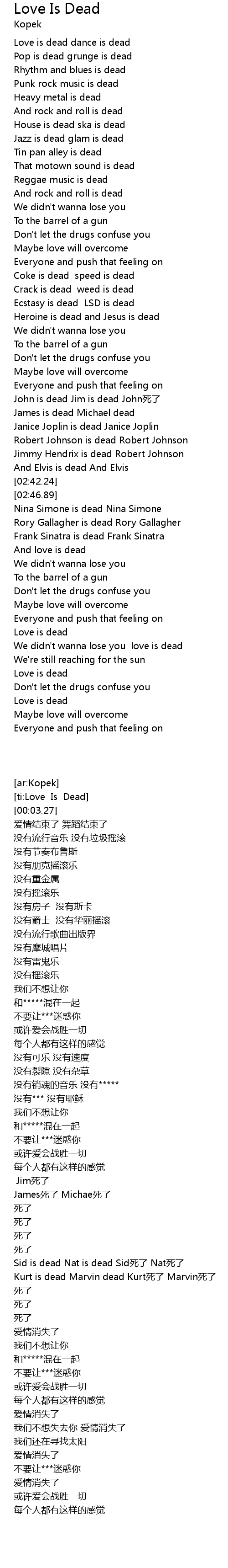 | [03:27.31] | We didn' t wanna lose you love is dead |