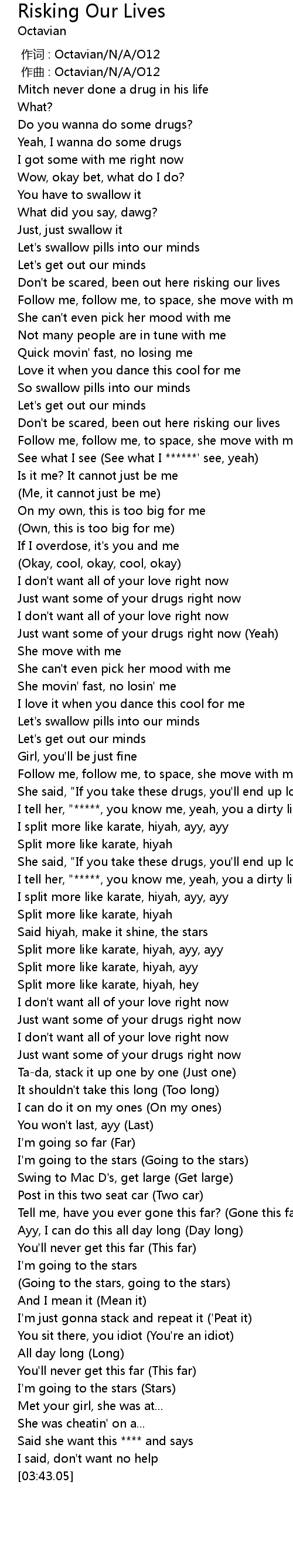 | [00:43.72] | Don't be scared, been out here risking our lives |