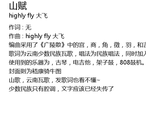 | 歌词为云南少数民族瓦歌,唱法为民族唱法,同时加入了一点呼麦的内蒙技巧。 | |
