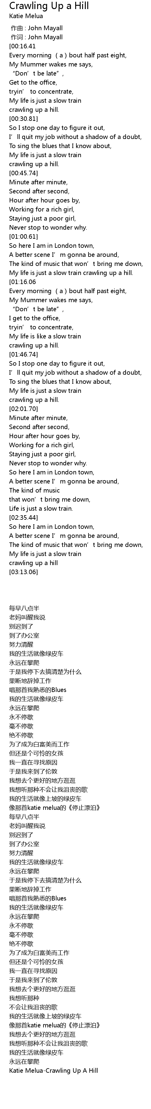 | [01:11.97] | My life is just a slow train crawling up a hill. |