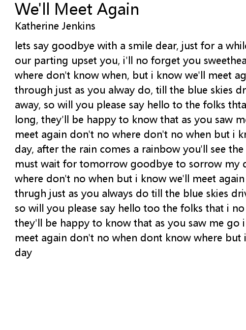 lets say goodbye with a smile dear, just for a while dear we must part, dont let our parting upset you, i'll no forget you sweetheartwe'll meet again don't know where don't know when, but i know we'll meet again some sunny day keep smiling through just as you alway do, till the blue skies drive the dark clouds far away, so will you please say hello to the folks thta i know tell themi wont be long, they'll be happy to know that as you saw me go i was singingtis song we'll meet again don't no where don't no when but i know we'll meet again some sunny day, after the rain comes a rainbow you'll see the rain go never fear we too must wait for tomorrow goodbye to sorrow my dear we'll meet again don't know where don't no when but i know we'll meet again some sunny day keep smiling thrugh just as you always do till the blue skies drive the dark clouds far away so will you please say hello too the folks that i no tell them i won't be long they'll be happy to know that as you saw me go i was singing this song we'll meet again don't no when dont know where but i know we'll meet again some sunny day |