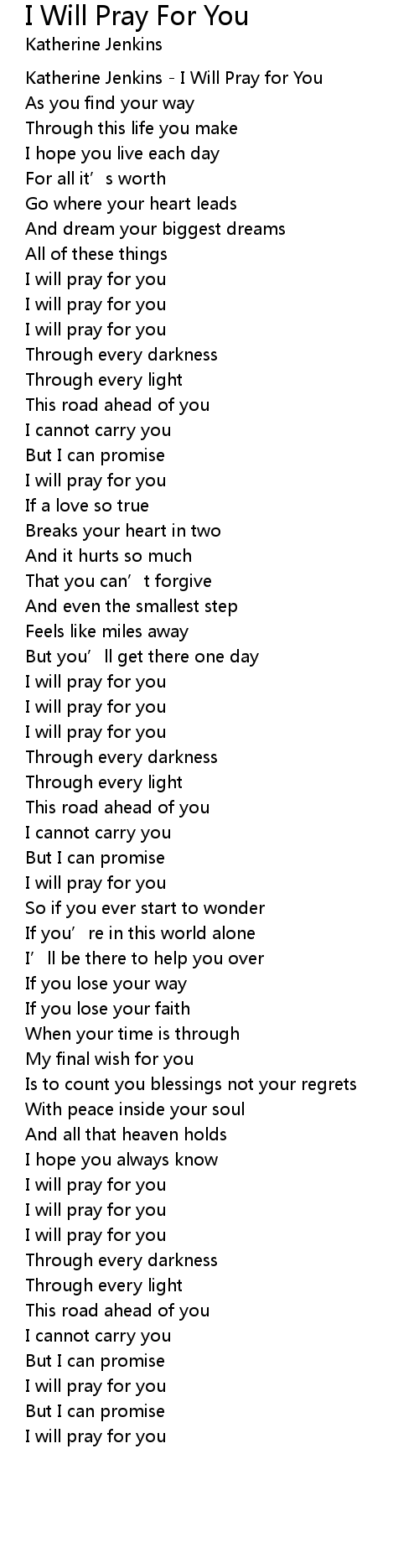 | [00:06.97] | Katherine Jenkins I Will Pray for You |