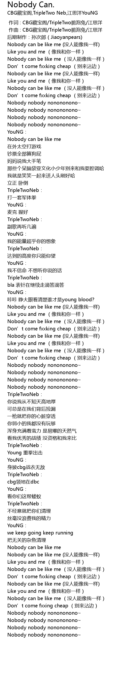 | [01:16.807] | Nobody can be like me méi rén néng xiàng wǒ yí yàng |