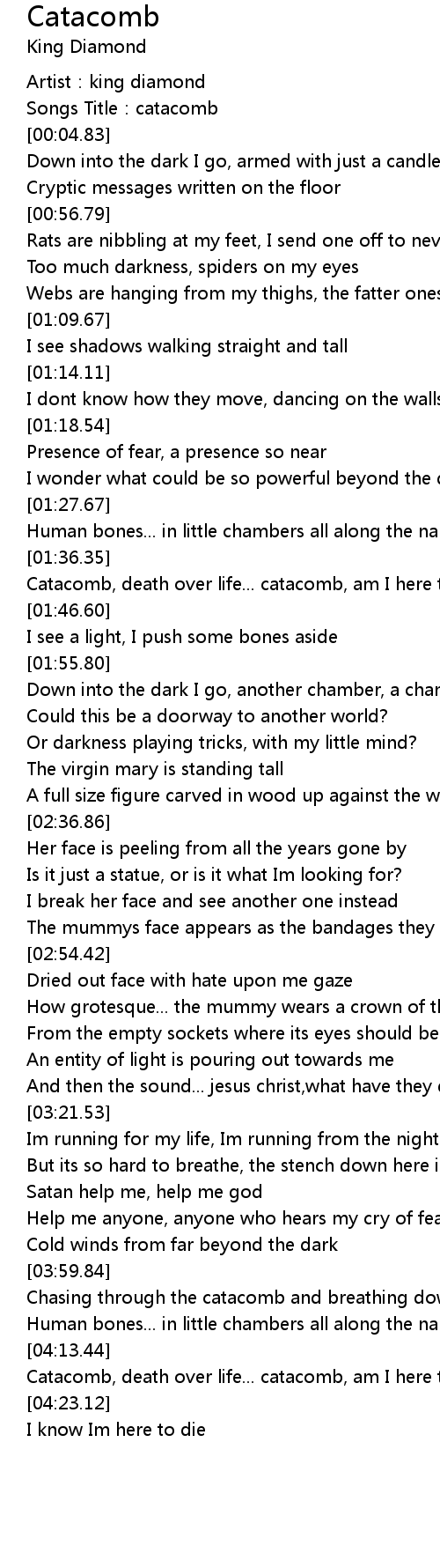 | [04:13.99] | Catacomb, death over life... catacomb, am I here to die? |