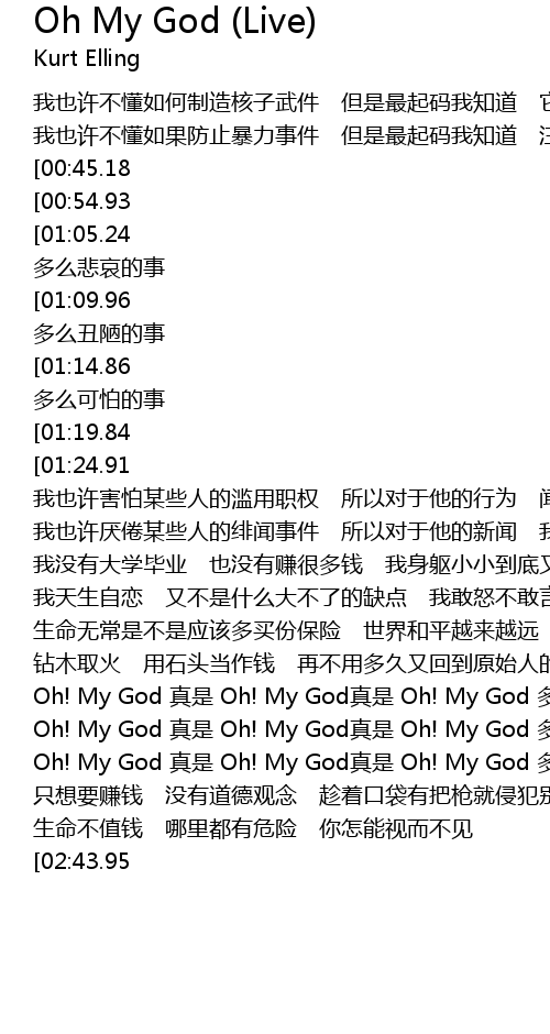 | [02:18.47][01:05.24] | Oh! My God 真是 Oh! My God真是 Oh! My God 多么悲哀的事 |
