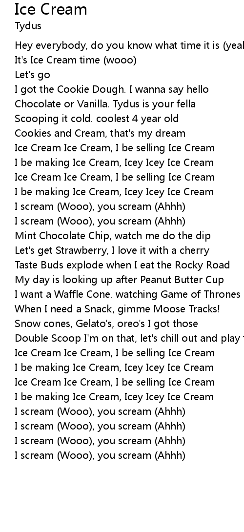 | [00:35.45] | I be making Ice Cream, Icey Icey Ice Cream |